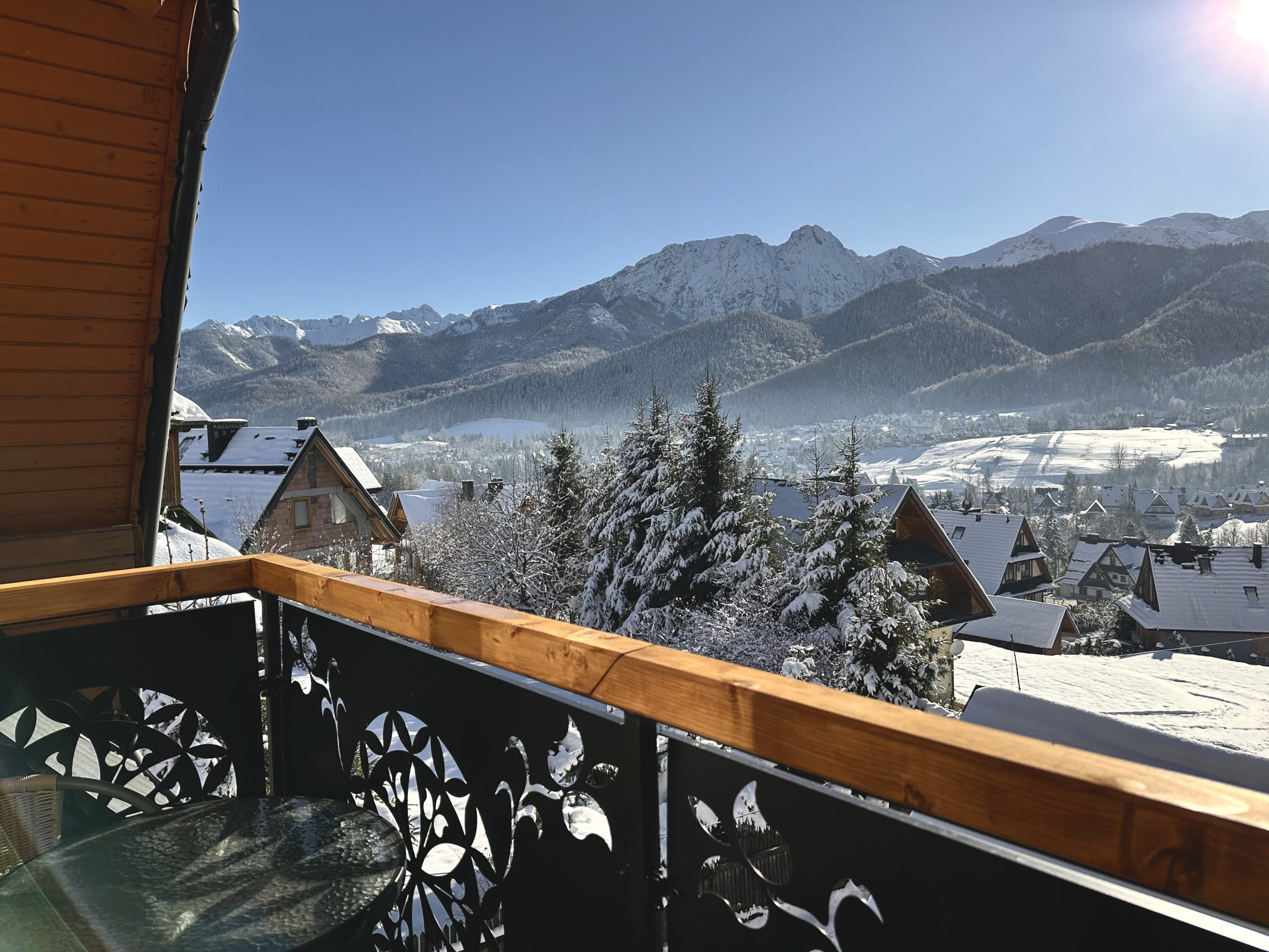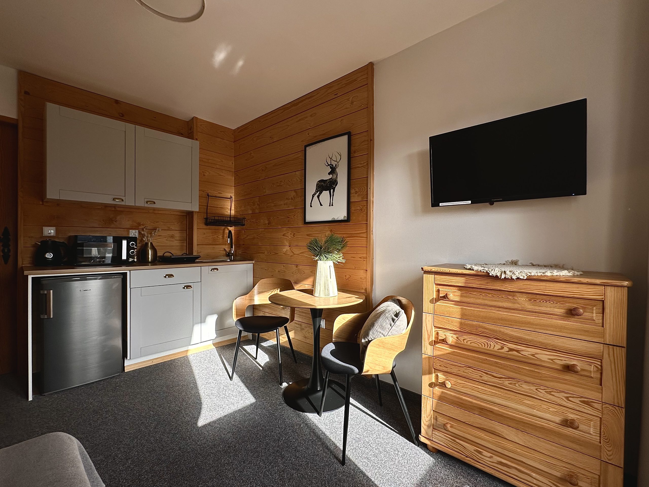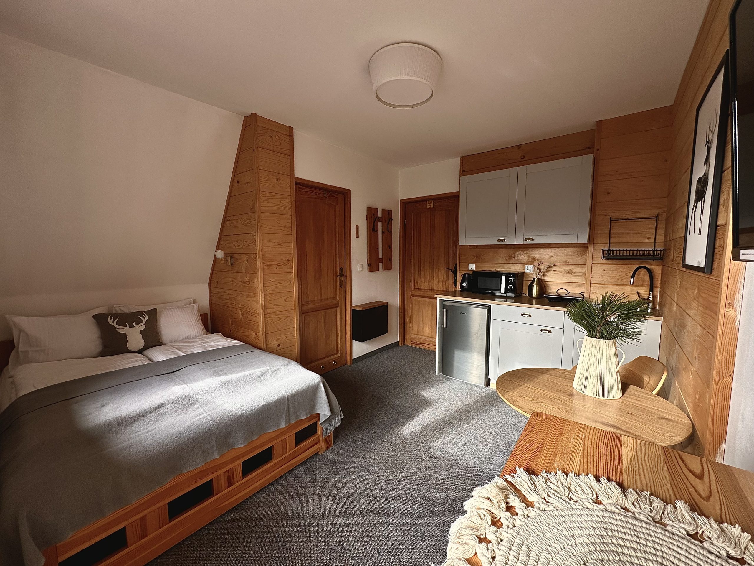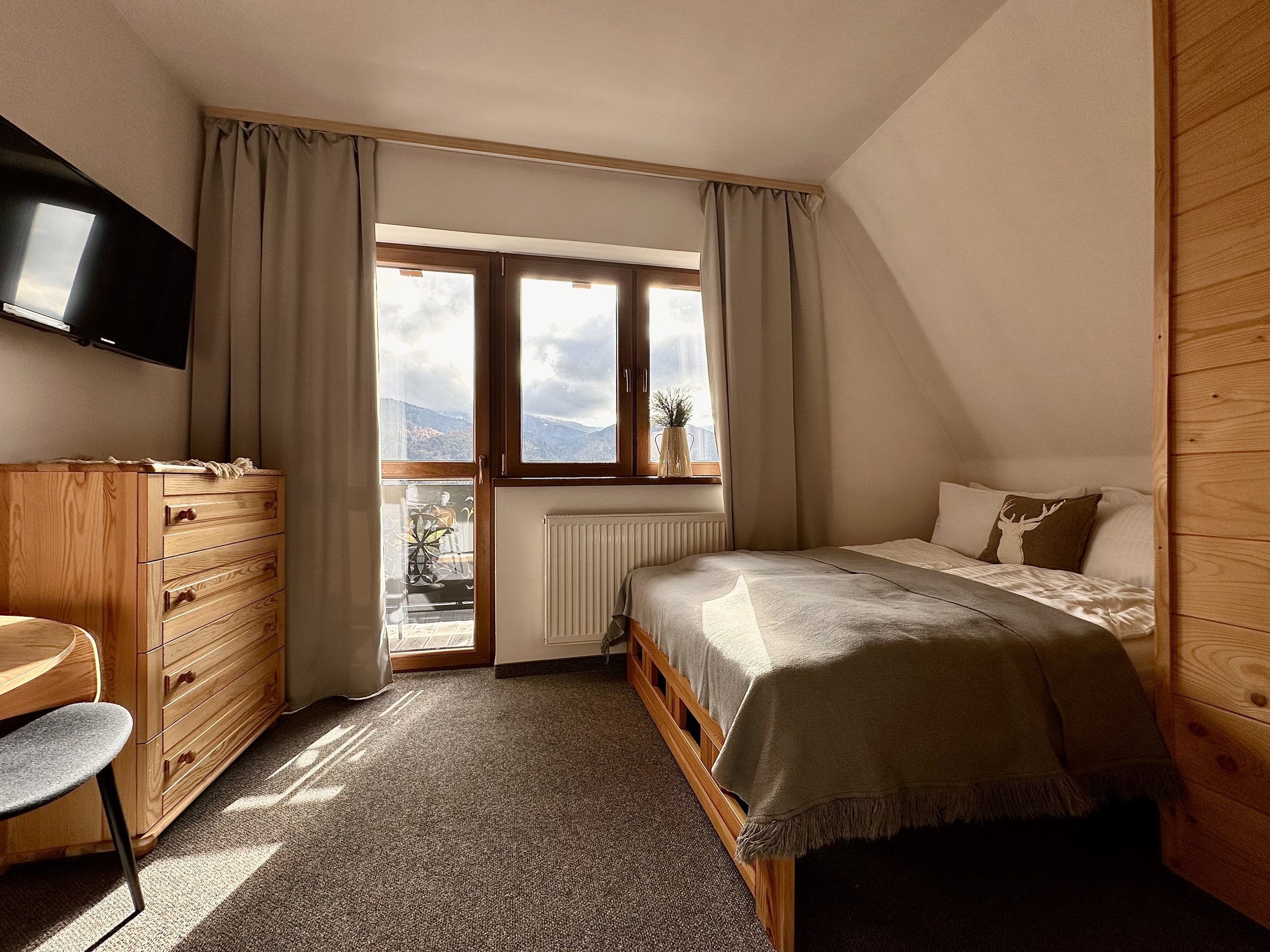 Romantyczny pokój z łóżkiem małżeńskim, aneksem kuchennym oraz balkonem z pięknym widokiem na góry.